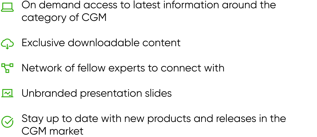 Members receive unlimited free access to exclusive industry event presentations, clinical research, training resources, and the latest developments in CGM technology.